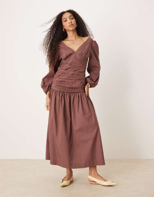 ASOS DESIGN - Robe longue en popeline avec taille froncée - Chocolat