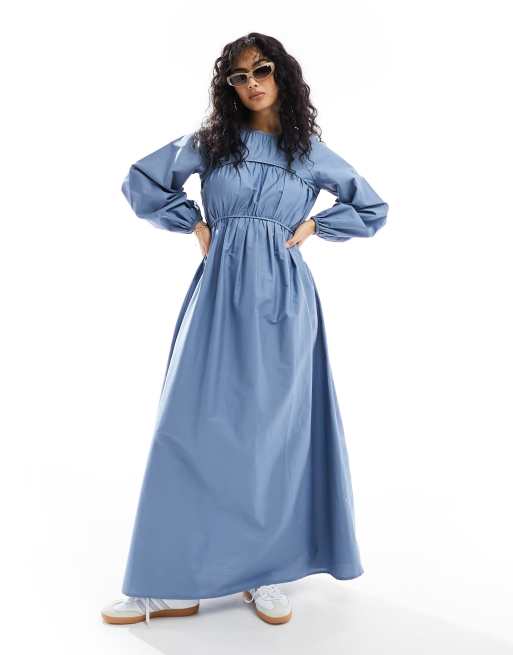 ASOS DESIGN - Robe longue en popeline de coton avec buste froncé - Bleu