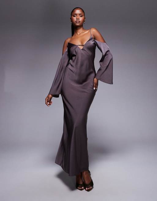 ASOS DESIGN - Robe longue en satin à épaules dénudées avec manches longues et lanières fines - Moka