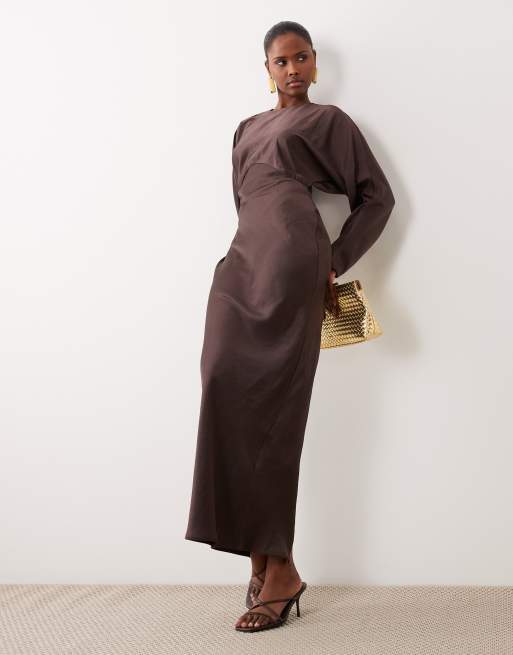 ASOS DESIGN - Robe longue en satin à manches chauve-souris - Chocolat