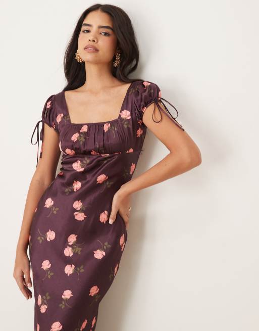 ASOS DESIGN - Robe longue en satin nouée devant à imprimé roses - Bordeaux