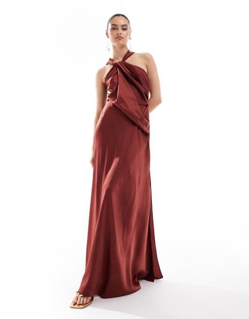 ASOS DESIGN - Robe longue et asymétrique en satin effet drapé - Marron