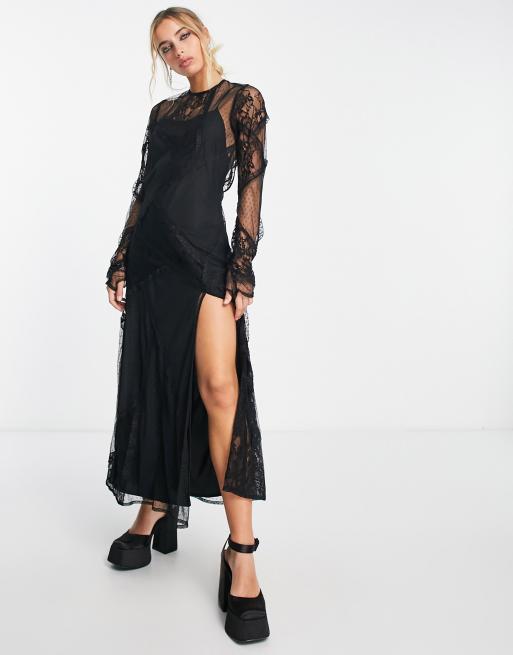 ASOS DESIGN - Robe longue fendue en dentelle avec dos nu - Noir