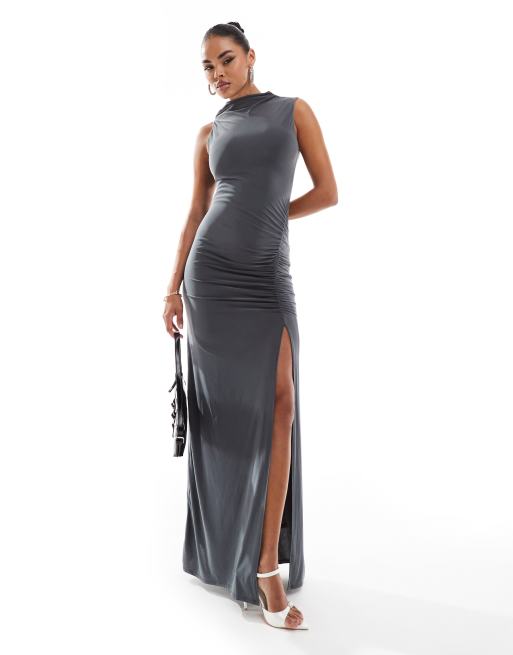 ASOS DESIGN - Robe longue froncée à col montant - Anthracite