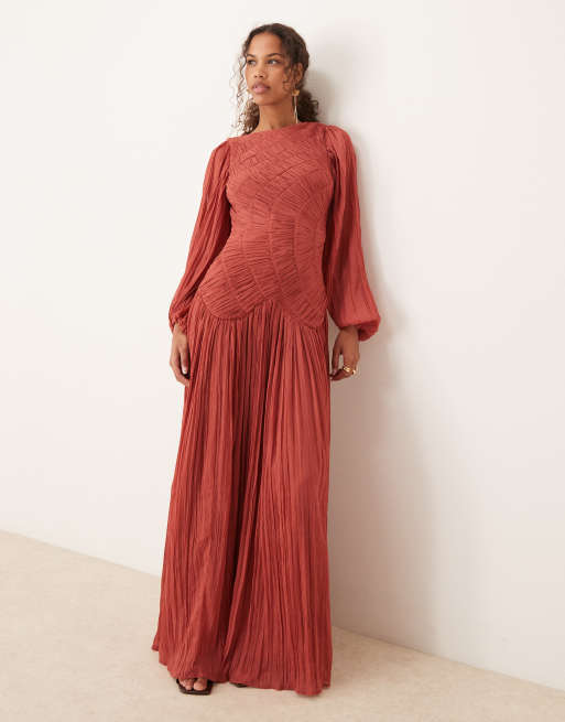 ASOS DESIGN - Robe longue froncée et froissée à manches longues, taille basse - Rouge