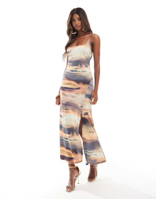 ASOS DESIGN - Robe longue nouée au dos à fines bretelles et encolure carrée avec imprimé soleil couchant