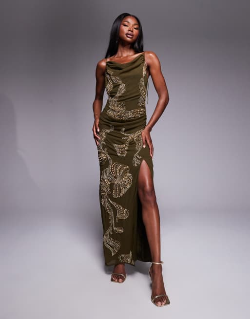 ASOS DESIGN - Robe longue ornementée à superposition avec jupe drapée et taille basse - Kaki