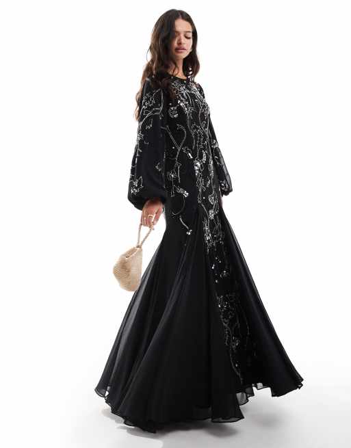ASOS DESIGN - Robe longue ornementée avec jupe à godets et manches ballon - Noir