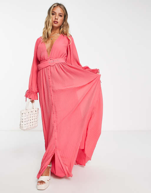 ASOS DESIGN - Robe longue plissée à manches blousantes avec ceinture - Rose