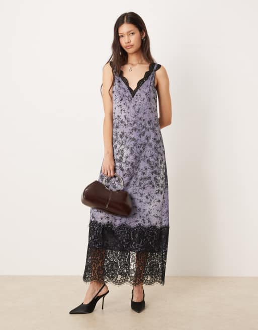 ASOS DESIGN - Robe longue satinée effet froissé à col en V imprimé floral et détails en dentelle - Noir