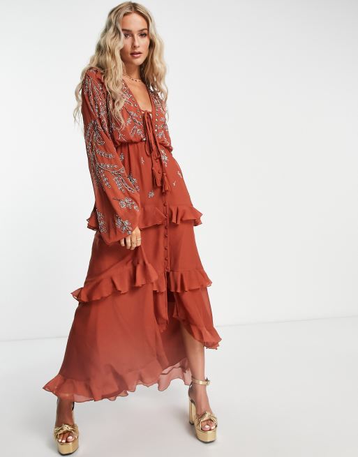 ASOS DESIGN - Robe longue souple boutonnée sur le devant et ornée de fleurs - Rouille