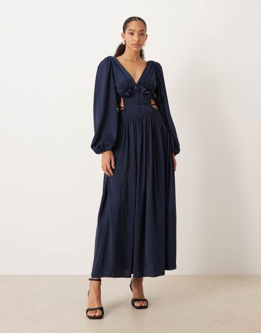 ASOS DESIGN - Robe longueur mollet en satin à découpes et décolleté plongeant - Bleu marine