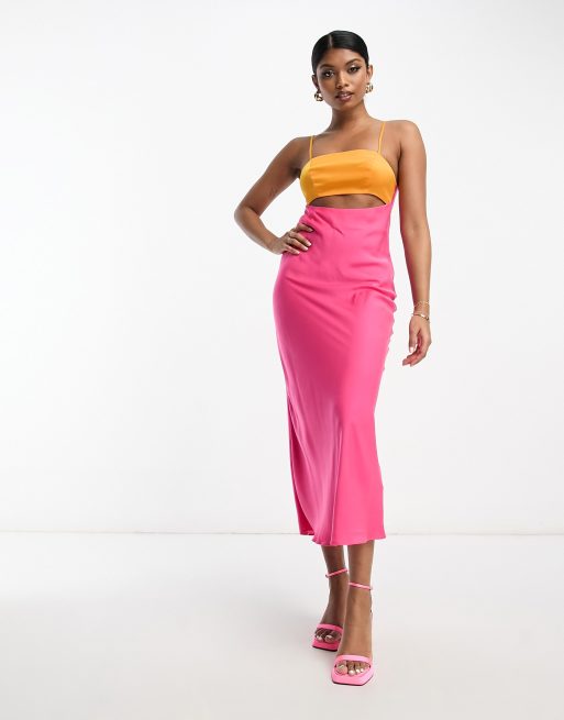 ASOS DESIGN - Robe longueur mollet en satin colour block à découpe - Rose