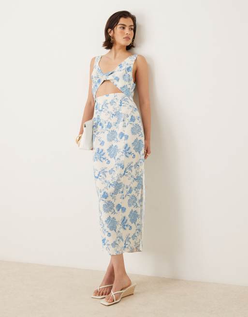 ASOS DESIGN - Robe mi-longue à bretelles fines et imprimé fleuri avec découpes et détail torsadé sur l'avant