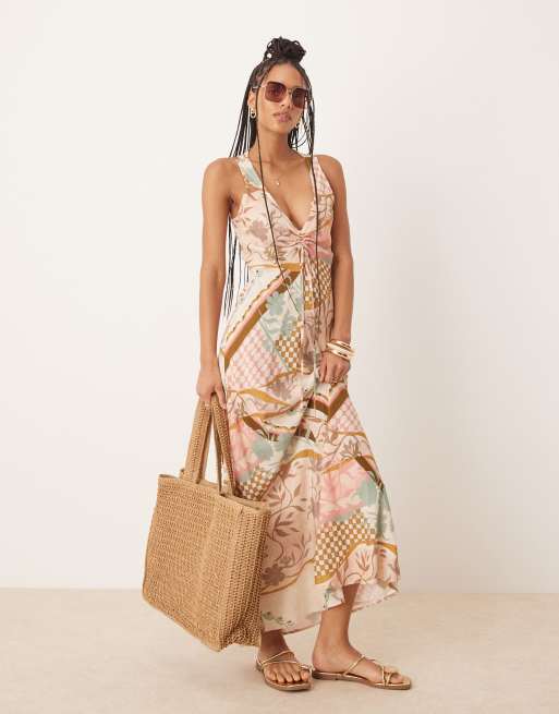 ASOS DESIGN - Robe mi-longue à col V, froncée et nouée - Rose fleuri abstrait