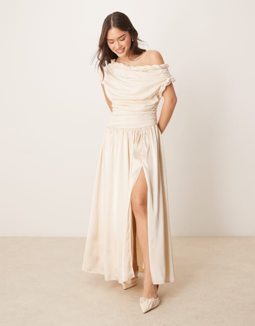 ASOS DESIGN - Robe mi-longue à corsage froncé, jupe satinée et encolure torsadée - Crème