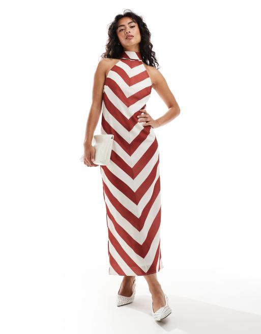 ASOS DESIGN - Robe mi-longue à encolure américaine montante - Bordeaux rayé