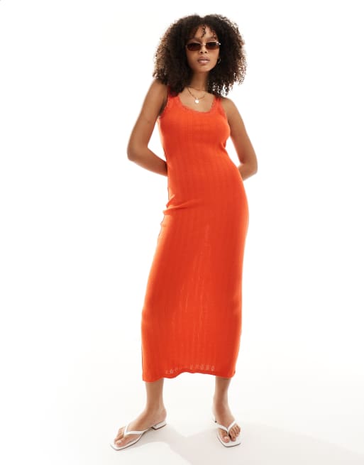 ASOS DESIGN - Robe mi-longue à encolure dégagée en maille pointelle et dentelle - Rouge cerise