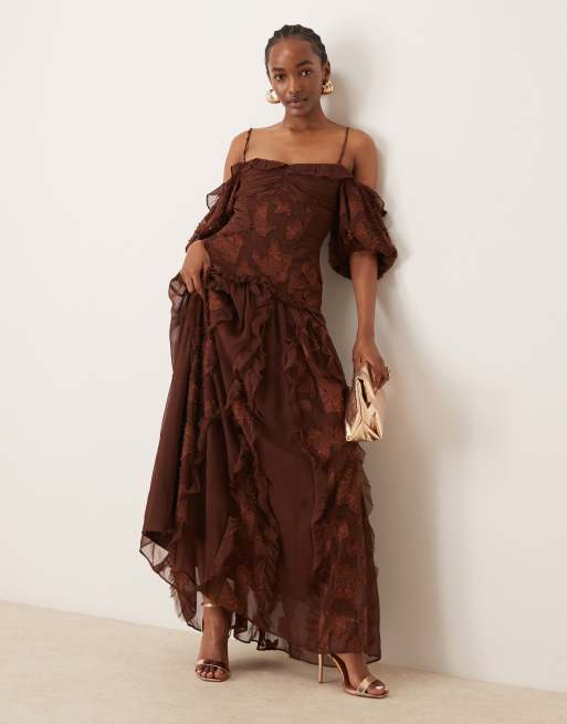 ASOS DESIGN - Robe mi-longue à épaules dénudées et manches bouffantes avec ourlet asymétrique en jacquard fleuri - Rouille foncé