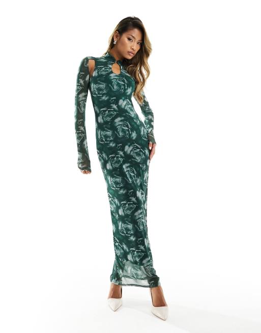 ASOS DESIGN - Robe mi-longue à imprimé roses avec manches longues et découpes au niveau du col - Vert
