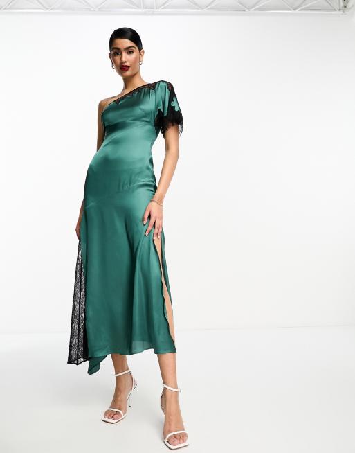 ASOS DESIGN - Robe mi-longue asymétrique en satin à fente et dentelle contrastante - Vert foncé