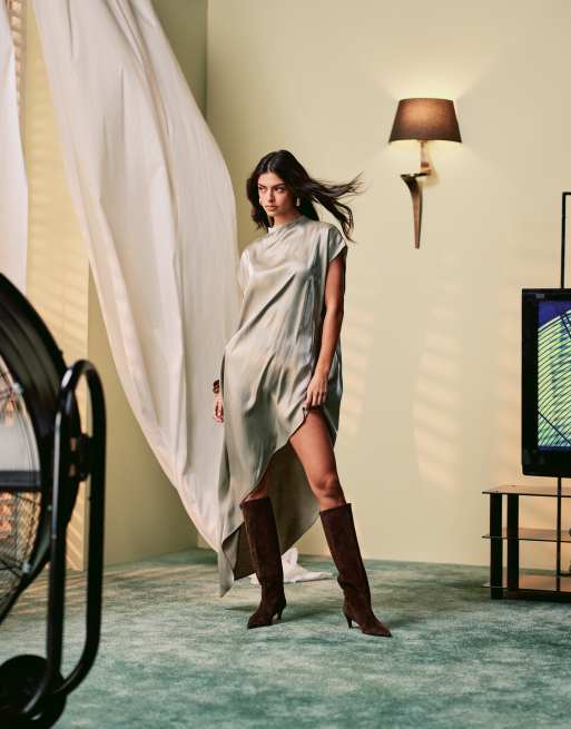 ASOS DESIGN - Robe mi-longue asymétrique style cape avec col montant - Vert chatoyant