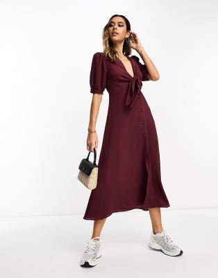 ASOS DESIGN - Robe mi-longue boutonnée nouée sur le devant - Bordeaux
