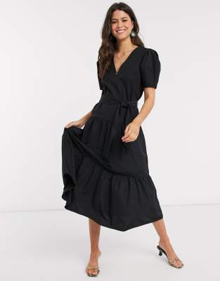 ASOS DESIGN - Robe mi-longue col V avec ceinture et jupe à volant - Noir