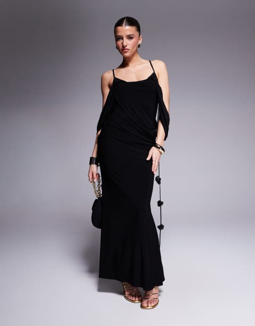 ASOS DESIGN - Robe mi-longue effet drapé avec encolure bardot superposée et détails fleurs - Noir