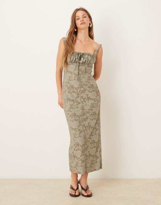 ASOS DESIGN - Robe mi-longue en dévoré avec buste froncé et détail corset - Kaki