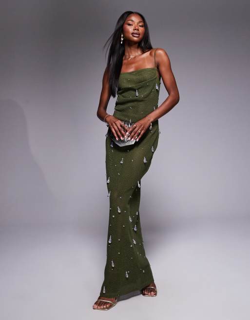 ASOS DESIGN - Robe mi-longue en maille crochetée avec bretelles fines et sequins irisés façon goutte d'eau - Kaki
