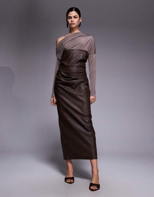 ASOS DESIGN - Robe mi-longue en PU à épaule tombante - Chocolat