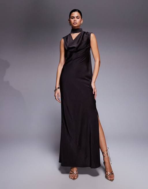 ASOS DESIGN - Robe mi-longue en satin à col bénitier avec foulard et dos torsadé - Chocolat foncé