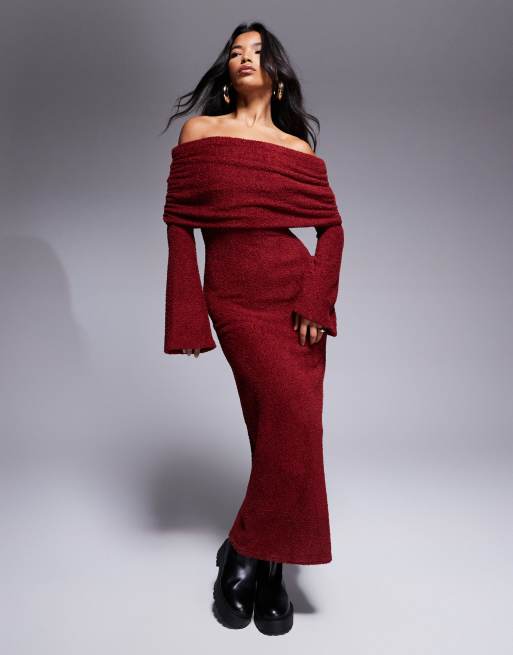 ASOS DESIGN - Robe mi-longue en tissu duveteux ultra doux à manches longues et encolure Bardot - Bordeaux