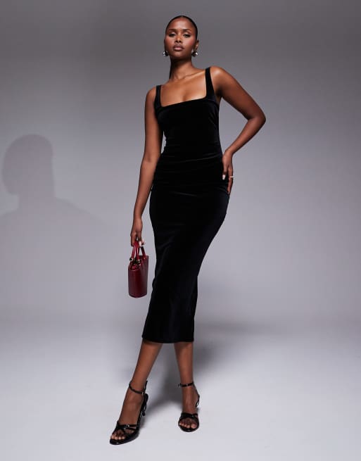 ASOS DESIGN - Robe mi-longue fendue en velours avec encolure incurvée - Noir