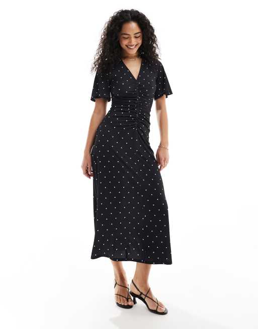 ASOS DESIGN - Robe mi-longue froncée devant avec imprimé à pois - Noir et blanc