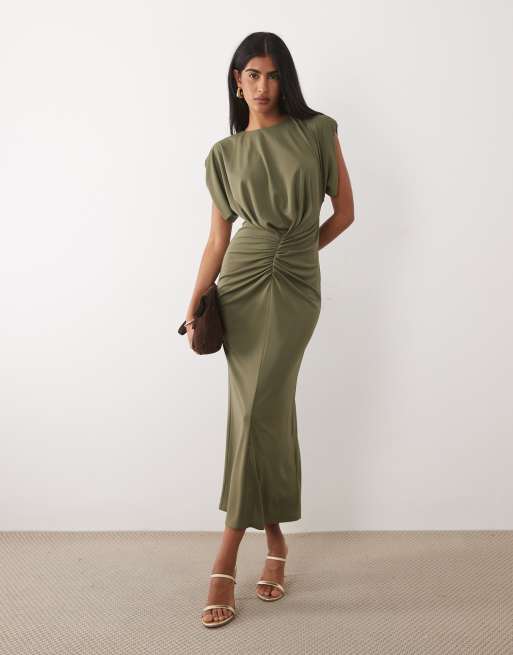 ASOS DESIGN - Robe mi-longue froncée sur le devant à épaules structurées - Kaki