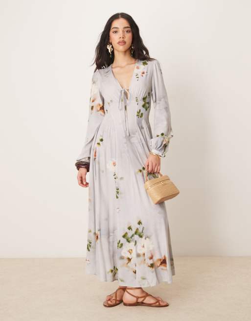 ASOS DESIGN - Robe mi-longue nouée devant avec col V et manches longues - Bleu à fleurs