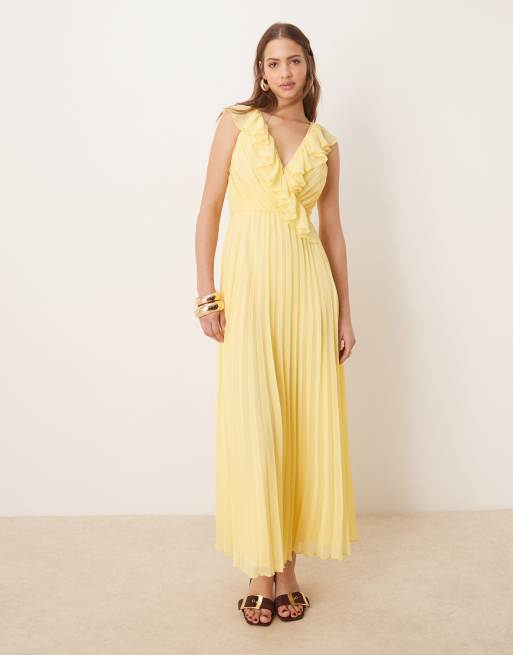 ASOS DESIGN - Robe mi-longue plissée avec détail croisé à volants - Jaune citron