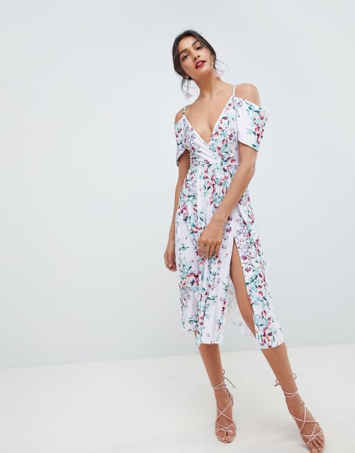 ASOS DESIGN - Robe mi-longue plissée effet châle au dos avec imprimé floral à rayures