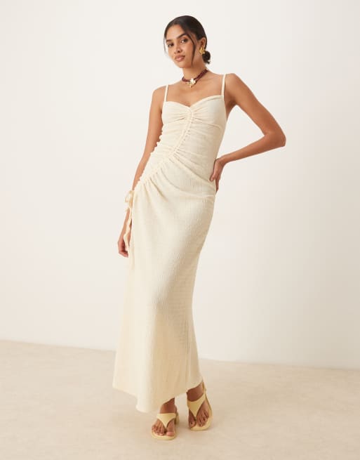 ASOS DESIGN - Robe mi-longue texturée et froncée devant à bretelles avec cordon de serrage - Crème