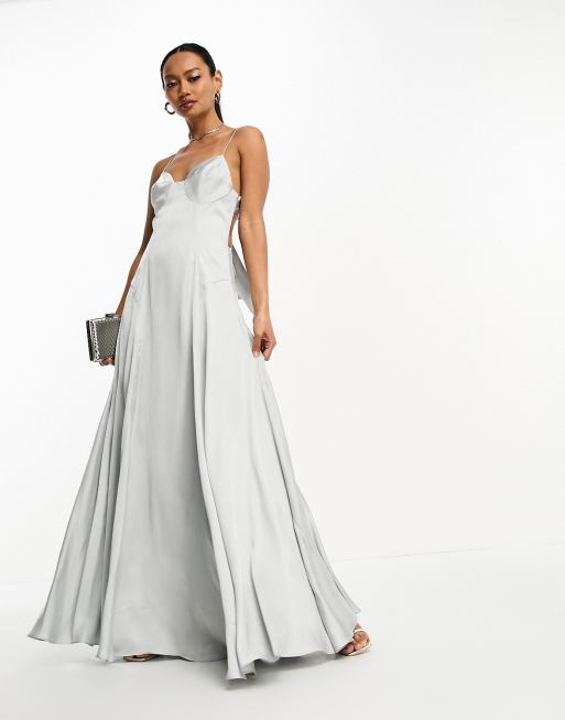 ASOS DESIGN - Robe patineuse longue en satin à bretelles dans le dos - Gris doux