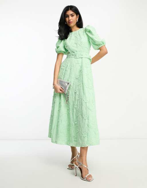 ASOS DESIGN - Robe patineuse mi-longue ceinturée en jacquard texturé - Vert pomme