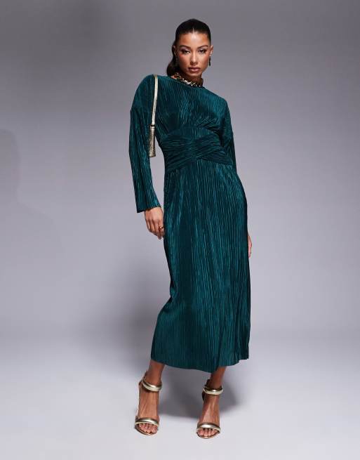 ASOS DESIGN - Robe plissée longue à taille croisée et manches longues avec col montant - Vert foncé