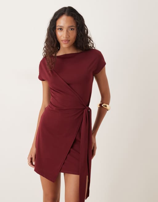 ASOS DESIGN - Robe portefeuille courte avec liens à nouer et mancherons - Bordeaux