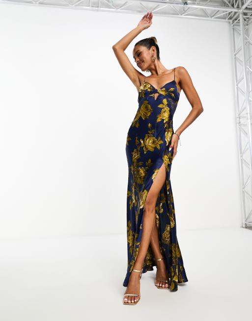 ASOS DESIGN - Robe satinée longue à imprimé fleuri avec fente goutte d'eau et empiècement en dentelle - Bleu marine