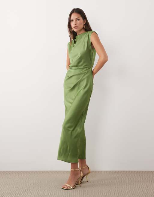 ASOS DESIGN - Robe satinée mi-longue avec buste plissé et col montant - Vert