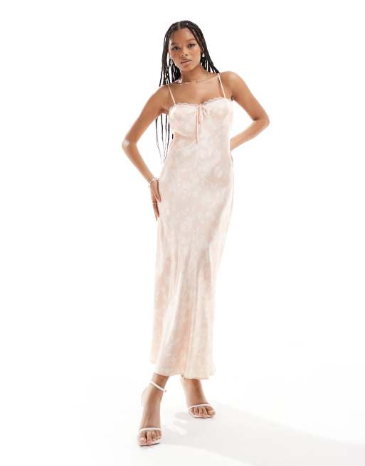 ASOS DESIGN - Robe satinée mi-longue avec imprimé fleuri et finitions en dentelle - Rose pâle