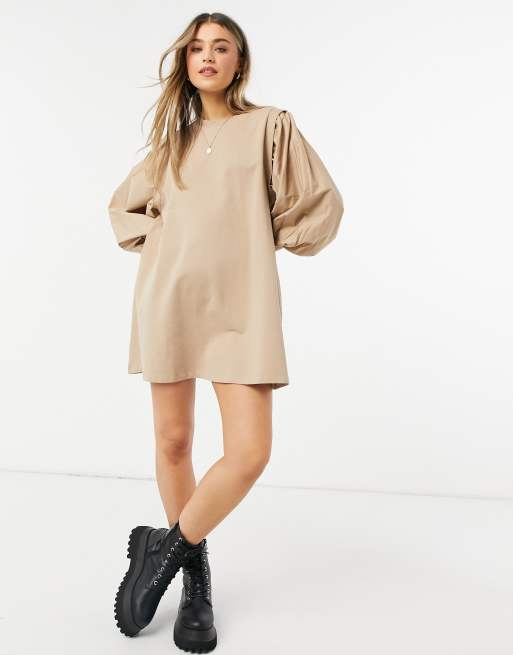 ASOS DESIGN - Robe sweat courte à manches bouffantes - Camel