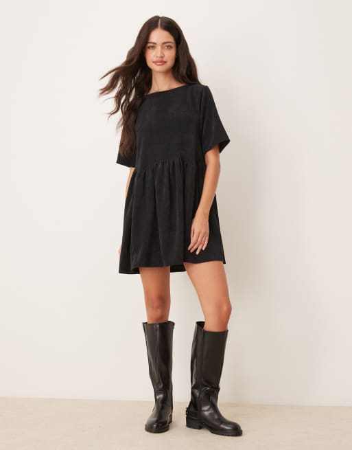 ASOS DESIGN - Robe t-shirt babydoll courte en velours côtelé avec couture à la taille - Noir
